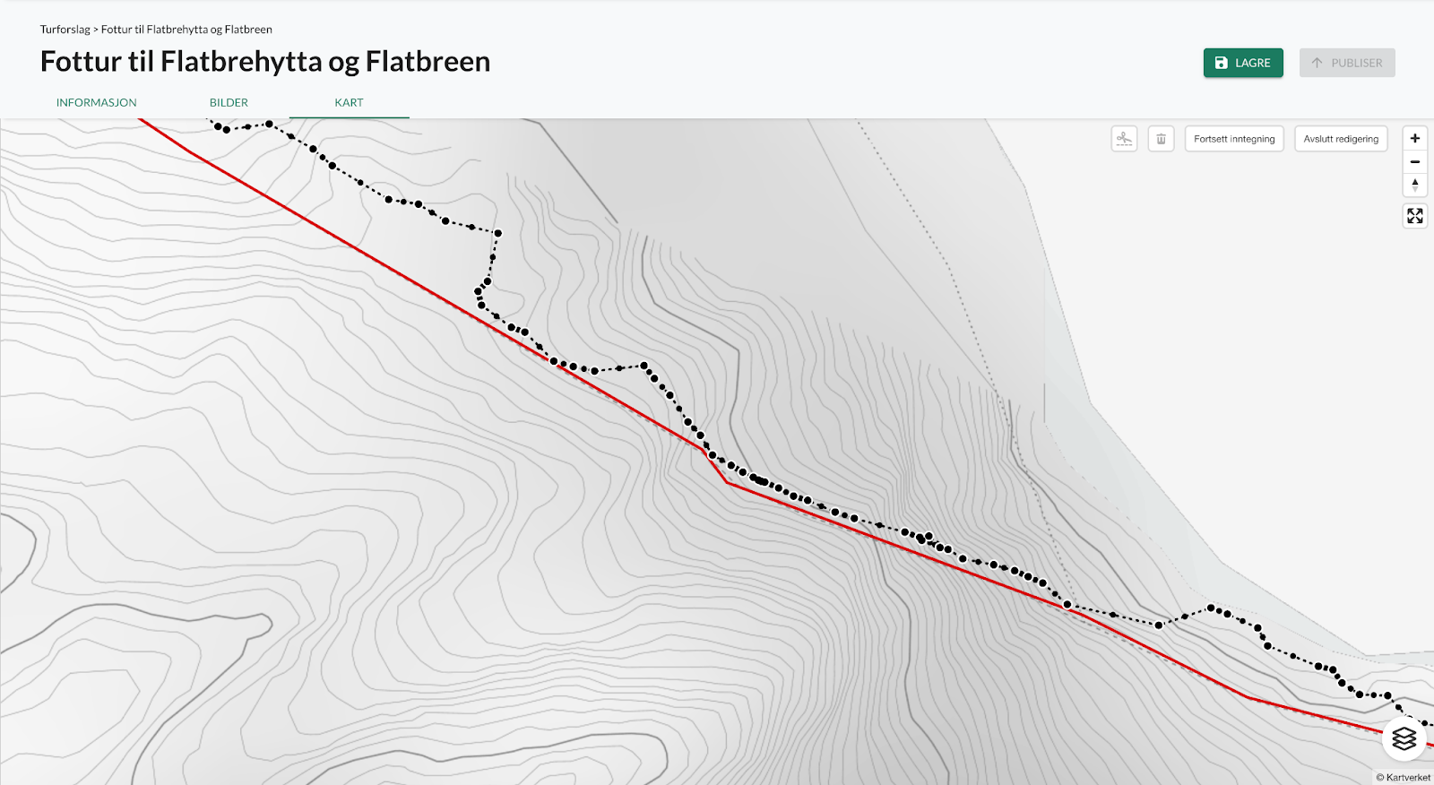 5) Når du er fornøyd med GPX-sporet klikker du på «Avslutt redigering» og på «Lagre» i høyre hjørne
