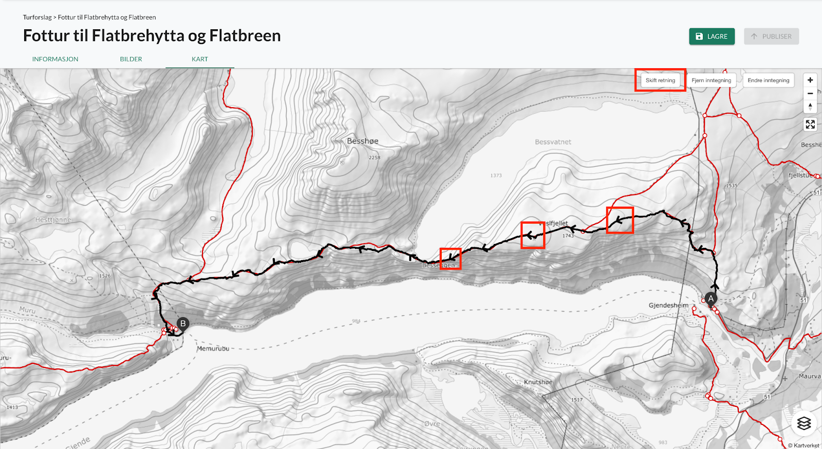 Klikk på «Endre inntegning» og zoom godt inn på startpunktet til ruten/sporet og gjennomgå sporet fra start til slutt. Klikk på de svarte sirklene langs GPX-sporet for å gjøre endringer.
