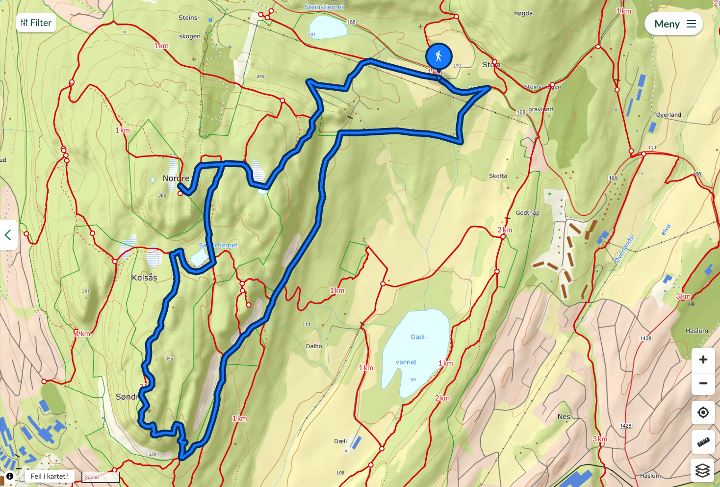 Middels-krevende fottur/rundtur med samme start- og sluttpunkt. Følger delvis DNT-rutenettet og delvis andre umerkede/merkede stier